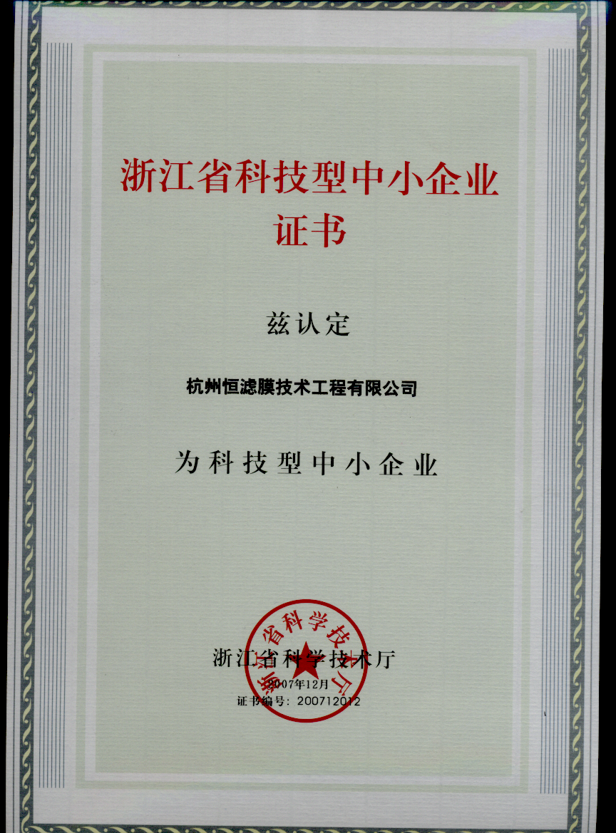 浙江省科技型中小企業證書